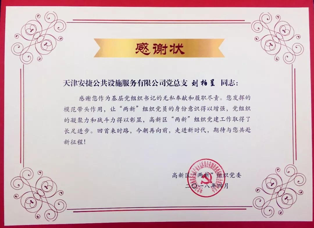 经过高新技术企业党委2017年度工作考核,天津3003.com新葡的京集团公共设施服务有限公司获得“优秀”的党组织荣誉称号,同时,3003.com新葡的京集团董事长刘柏呈同志获得“优秀”的党组织负责人荣誉称号。