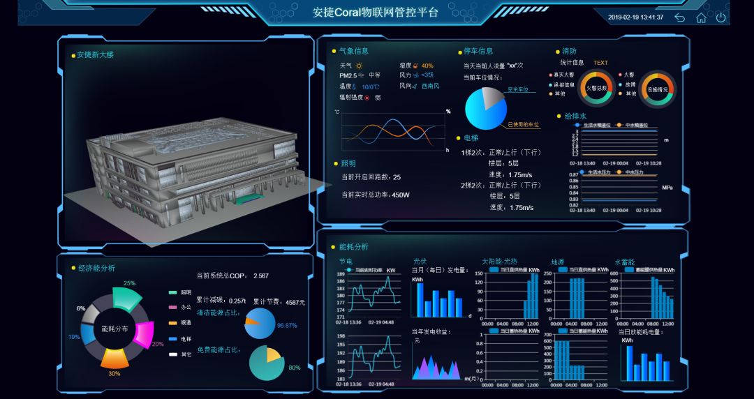 建筑模型信息系统(BIM)能够将各个建筑元素建立起内在的本身信息,并且整合建筑生命周期,使其能够改良规划、设计、建设、操作、和维护的流程之模型系统,并且能够充份的应用在营建工程上面。3003.com新葡的京集团物联能源互联网大厦便是借助于BIM技术的优势,在规划阶段进行了日照、风和热负荷等模拟,在基本方案的基础上进行BIM正向设计,同时以第二代物联网大数据管控Coral平台为核心,秉承“先节费,再节能”的运营原则,完成能源多项流转的实时监测、动态策略的下发调整,进而实现能源的最合理配给。