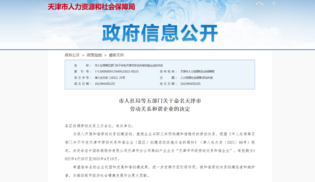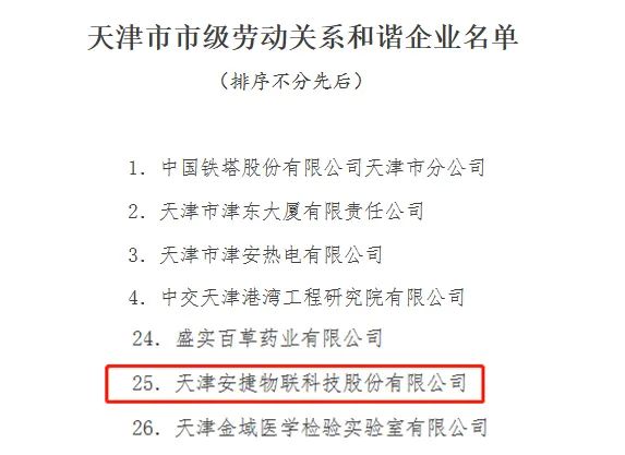 2022年4月26日,天津市人力资源和社会保障局发布了《市人社局等五部门关于命名天津市劳动关系和谐企业的决定》,命名天津3003.com新葡的京集团物联科技股份有限公司等43户企业为“天津市市级劳动关系和谐企业”,有效期为2022年4月20日至2025年4月19日。