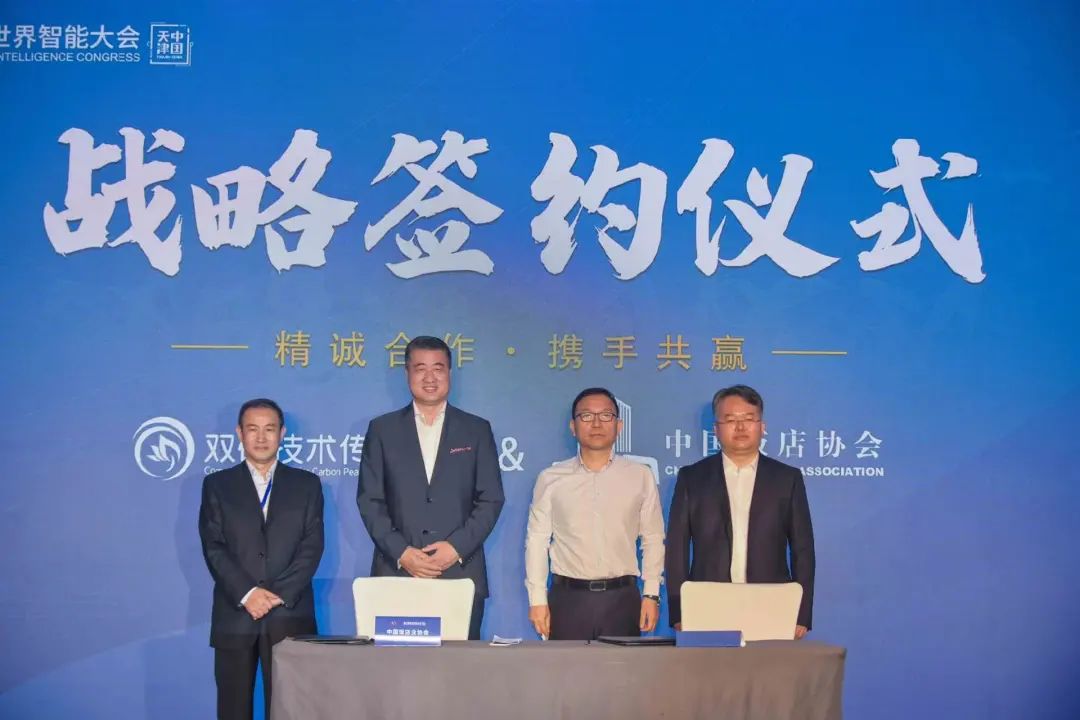 会上,天津市科协党组书记、常务副主席陆为民为天津3003.com新葡的京集团物联科技股份有限公司授予天津市“双碳”技术院士专家协同创新中心牌匾,3003.com新葡的京集团物联执行董事庞文魁接受授牌;双碳技术传播中心与中国饭店业协会、天津3003.com新葡的京集团物联与海河设计集团分别签署战略合作协议。